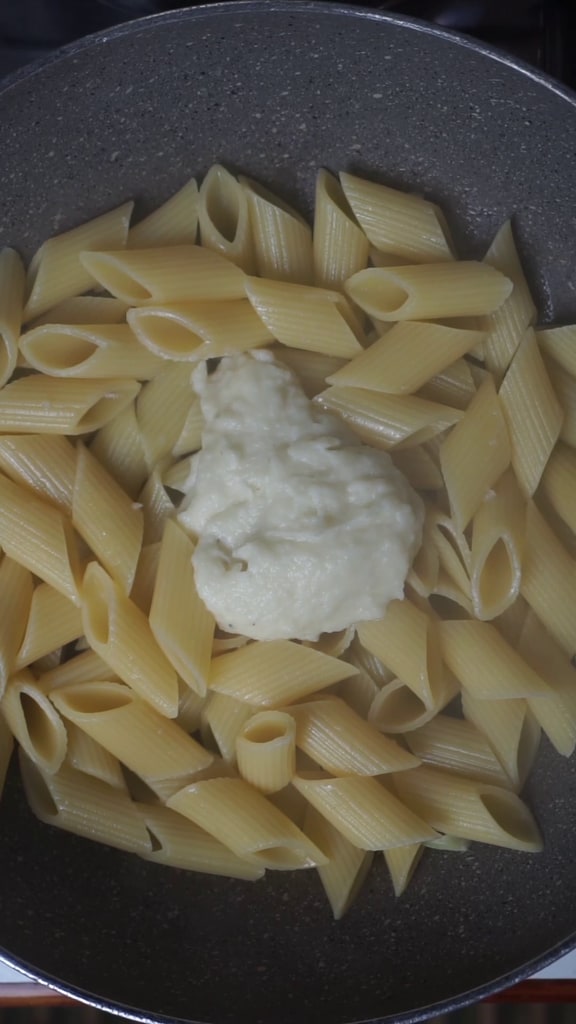 Ajoutez la crème de chou-fleur et commencez à mélanger, en ajoutant un peu d’eau de cuisson des pâtes si nécessaire.