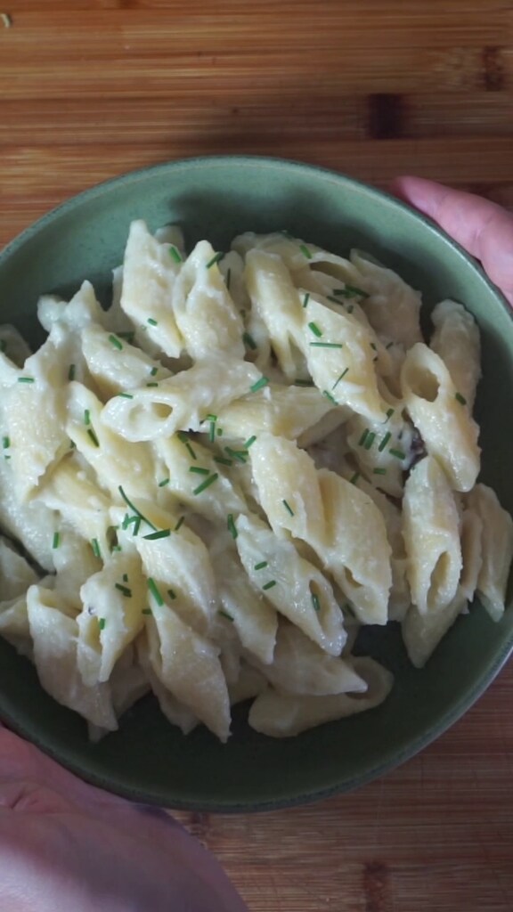 Servez immédiatement et bien chaudes les pâtes à la crème de chou-fleur en décorant l’assiette à votre guise avec un peu de ciboulette ciselée et/ou de la poudre de noisettes.