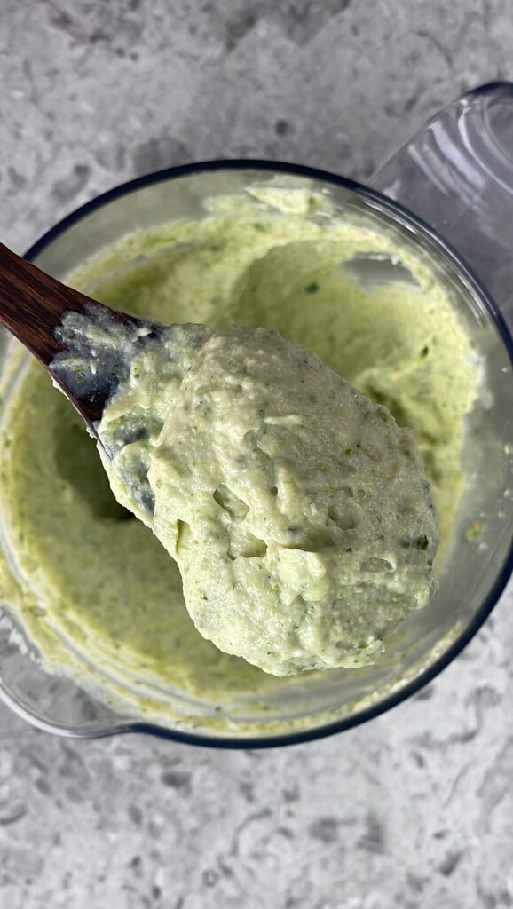 Ajoutez la crème de courgettes et ricotta et une louche d’eau de cuisson.