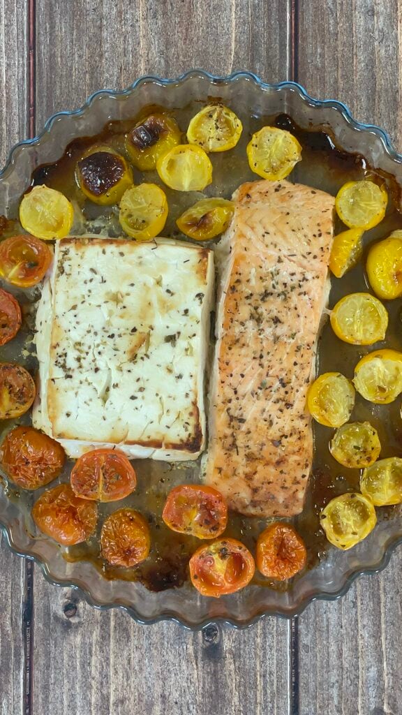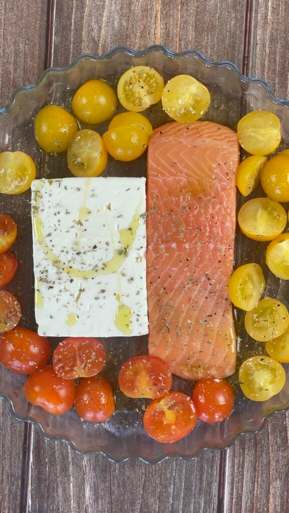 Mettez dans un plat à gratin la feta grecque, le saumon et les tomates cerises.
