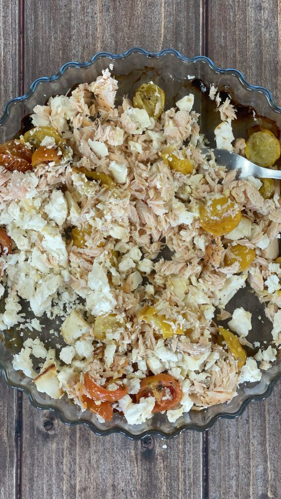 Sortez du four et écrasez la feta grecque et le saumon à l’aide d’une fourchette.