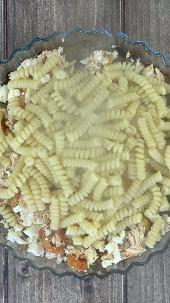 Ajoutez les pâtes à l’assaisonnement à base de feta.Mélangez avec une cuillère et si les pâtes semblent trop sèches, ajoutez un peu d’eau de cuisson.
