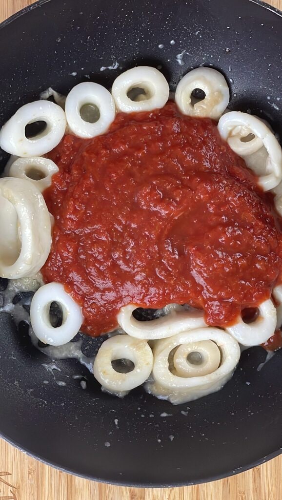 Ajoutez les calmars coupés en anneaux et faites-les cuire pendant 5 minutes.