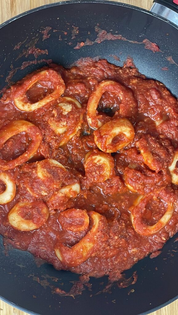 Faites cuire la sauce de calmars pendant une vingtaine de minutes à feu doux en ajoutant de l’eau si nécessaire.