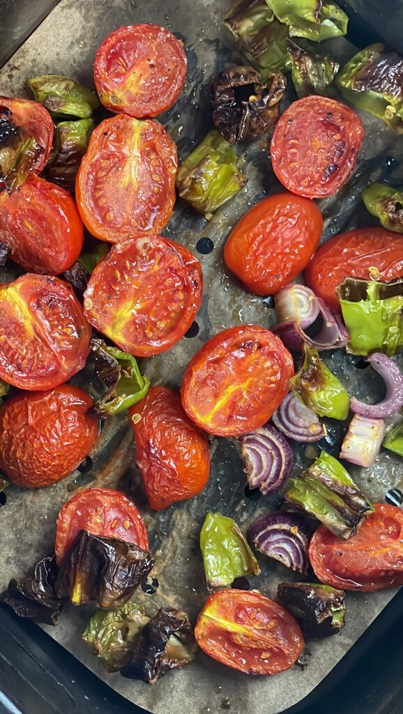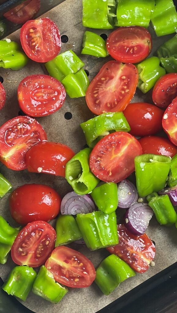 Cette recette est idéale lorsque vous avez envie d’un plat sain mais pas trop exigeant. J’ai fait cuire friggitelli et petites tomates dans une friteuse à air avec un filet d’huile, du sel et du poivre : en quelques minutes, ils deviennent tendres, rôtis juste comme il faut et prêts à être mélangés aux pâtes. Une étape rapide qui vous fait gagner du temps et allume moins de feux, surtout pendant les mois chauds.