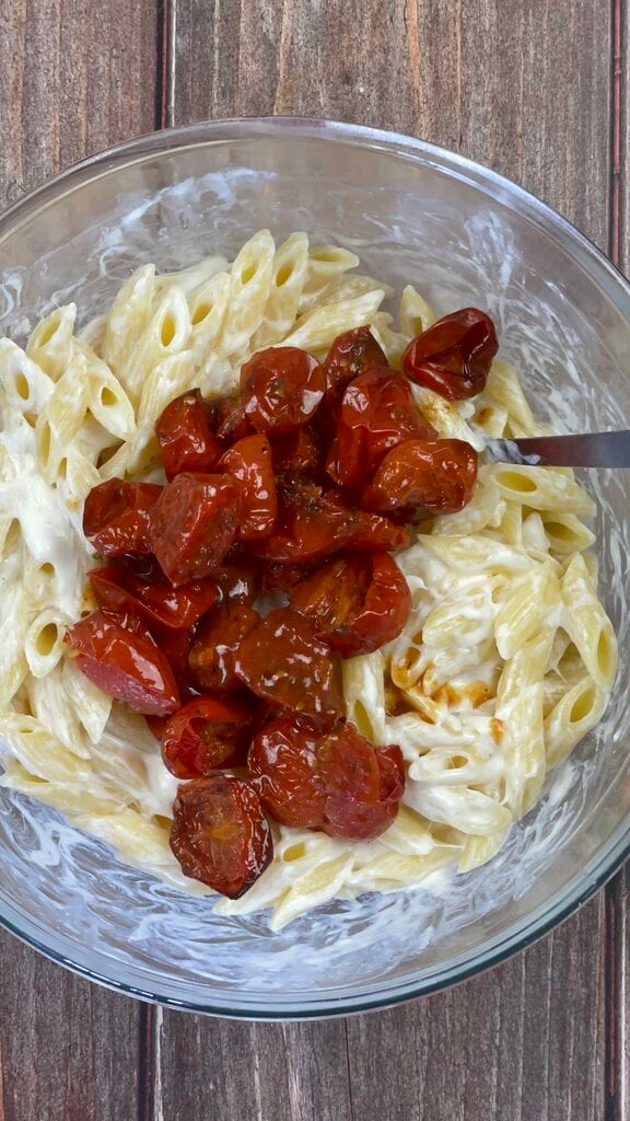 • Ajoutez dans le saladier de pâtes les tomates cerises réservées et mélangez à nouveau jusqu’à ce qu’elles soient réparties de manière homogène.
