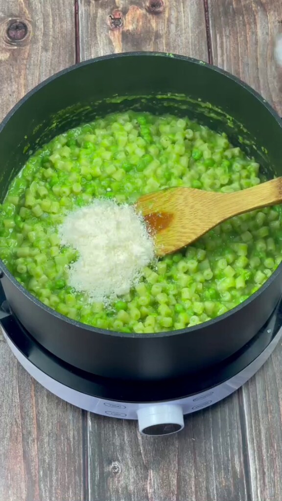 Pâtes et petits pois crémeuses façon risotto, un plat principal simple à préparer et extrêmement savoureux où vous ne salissez qu’une seule casserole !