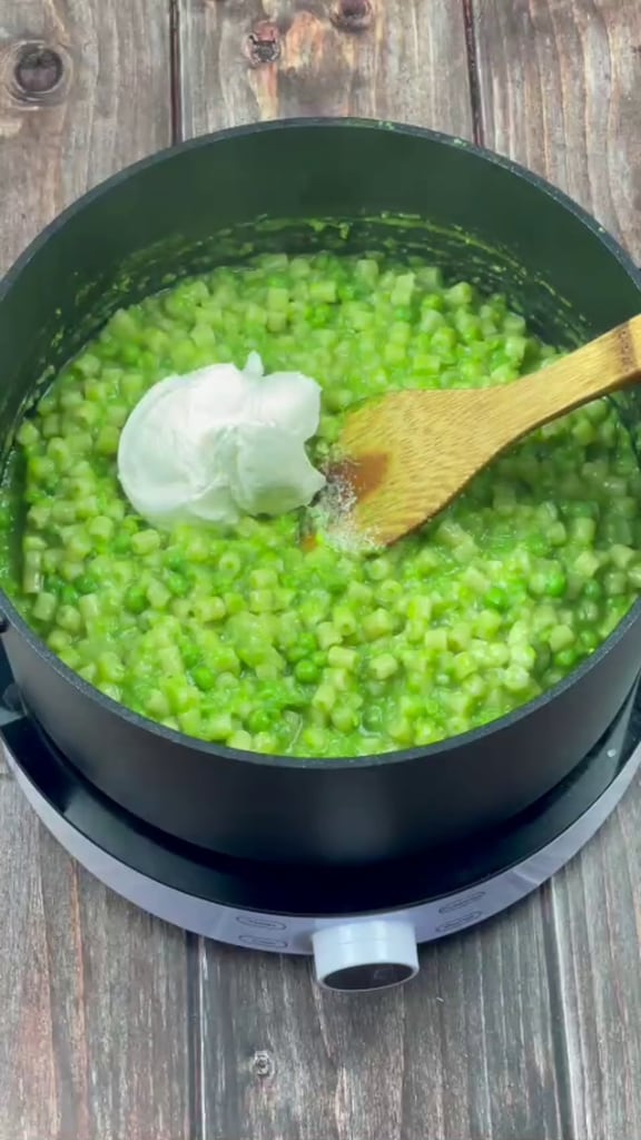 Servez immédiatement les pâtes et petits pois façon risotto crémeuses avec un filet d’huile d’olive extra vierge à cru et un peu plus de poivre noir au goût.