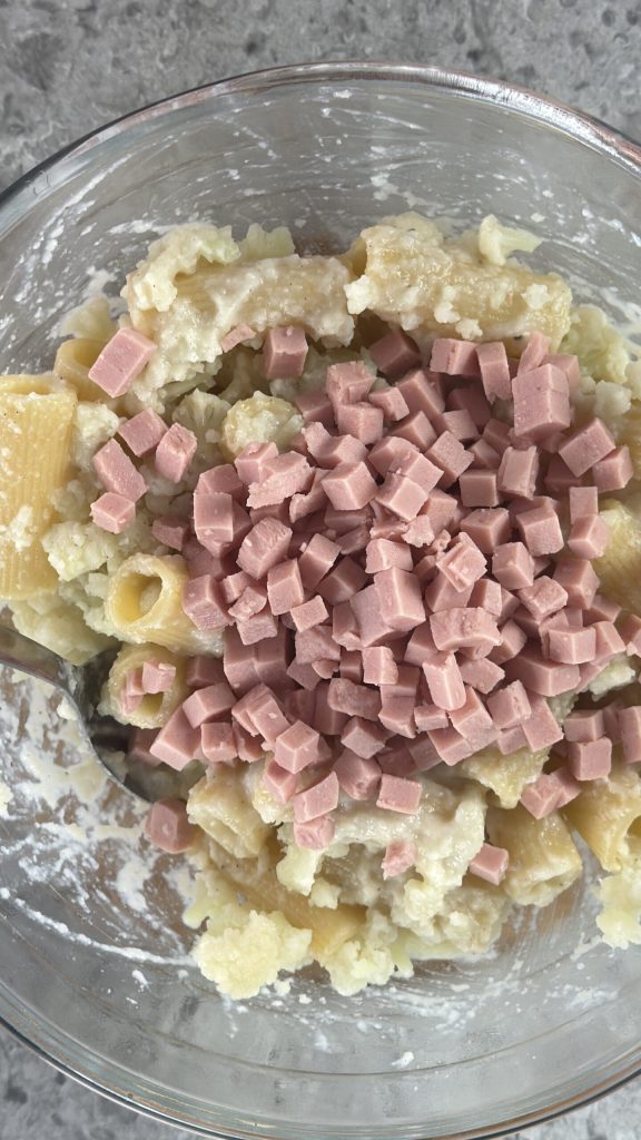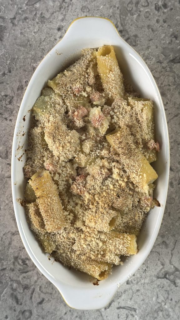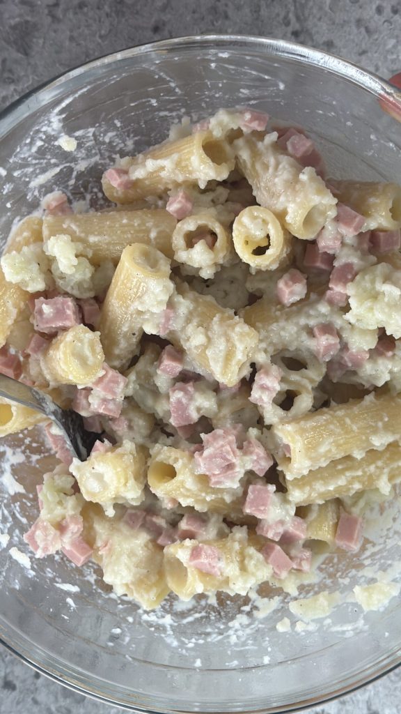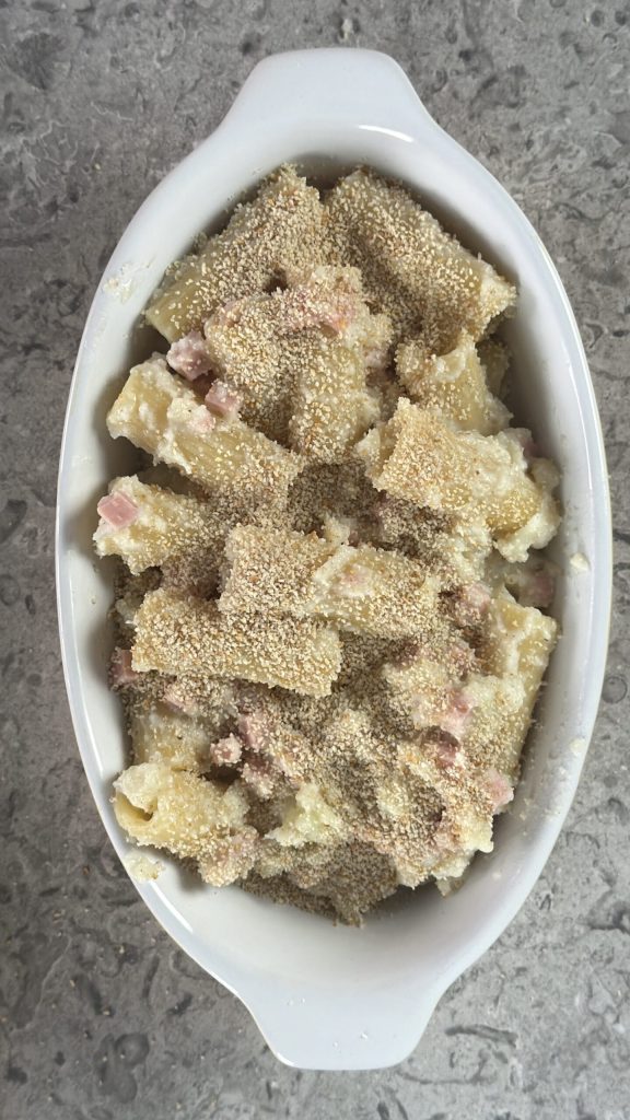 C’est un gratin de pâtes blanc, sans béchamel, mais tout aussi moelleux et réconfortant grâce à la crème de chou-fleur qui lie parfaitement chaque bouchée. Le jambon apporte de la saveur et rend le plat plus complet, tandis que la chapelure sur le dessus forme une croûte dorée et légèrement croustillante qui contraste avec la consistance crémeuse de l’intérieur.