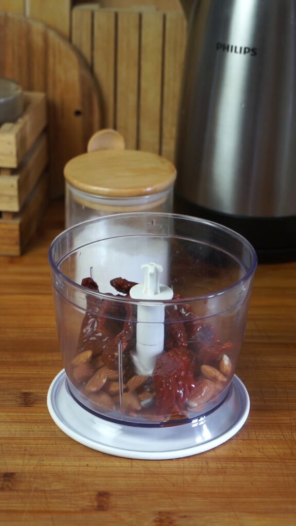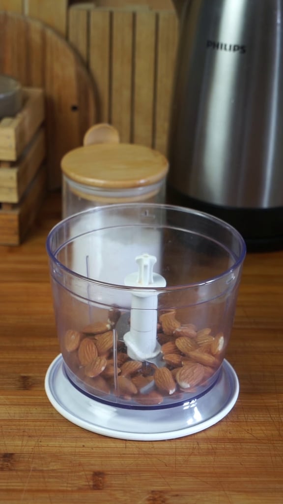 Commencez la préparation du pesto de tomates séchées, amandes et basilic en mettant dans un mortier ou un mixeur les amandes. Pour obtenir une crème plus lisse, mettez-les à tremper dans de l’eau pendant quelques heures.