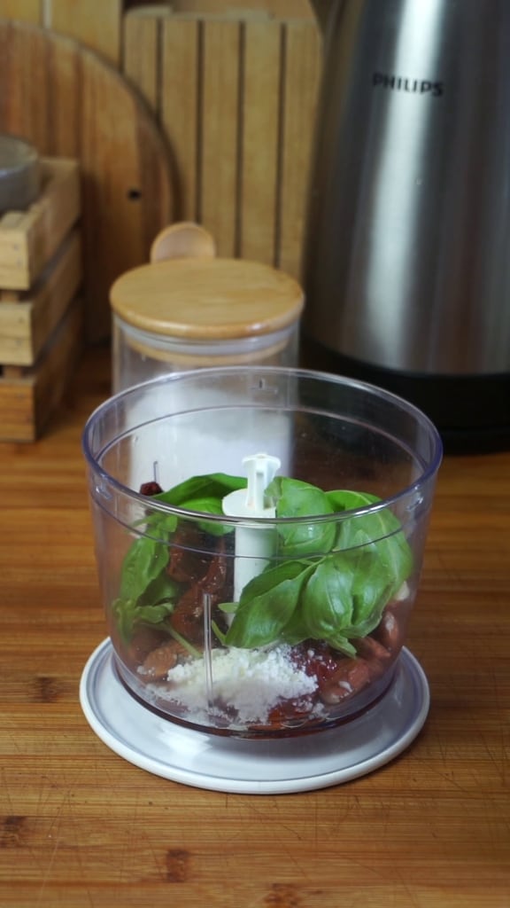 Le pesto de tomates séchées, amandes et basilic est un condiment très savoureux, très facile à préparer et qui ne nécessite pas de cuisson. Il peut être utilisé pour de nombreuses recettes différentes : des plats principaux aux bruschettas, je l’ai également utilisé avec satisfaction comme condiment principal pour la pizza ! Son goût rustique et prononcé vous séduira dès la première bouchée !