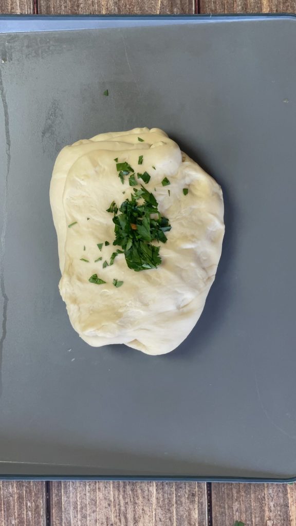 Répétez l’opération deux fois, toujours avec des intervalles de 10 minutes.Transférez la pâte sur un plan de travail, ajoutez la moitié du persil préalablement haché et pétrissez pendant quelques minutes pour l’incorporer.