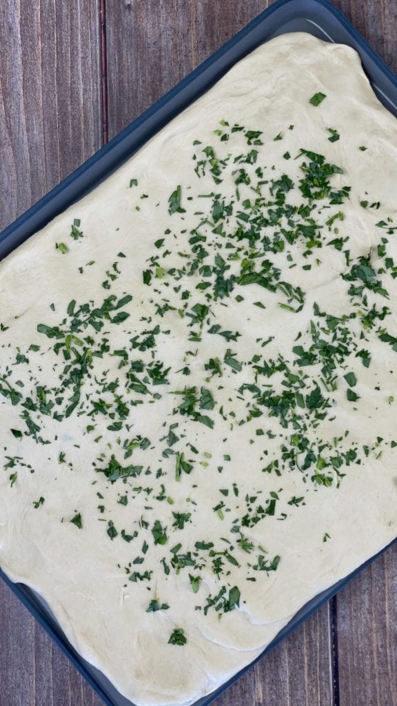 Hachez le reste du persil et dispersez-le sur la pâte étalée. Appuyez légèrement avec vos mains pour bien le faire adhérer.