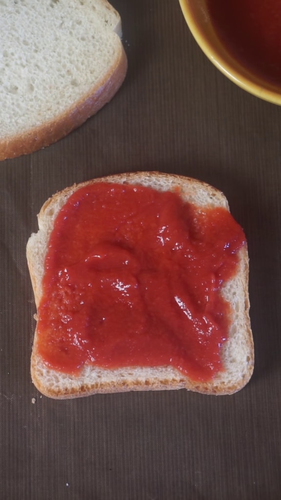 Répartis une cuillerée de purée de tomates sur chaque tranche de pain blanc.