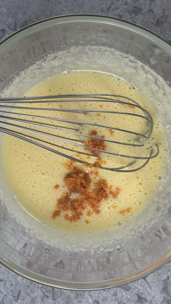 Ajoutez également le zeste d’orange et travaillez de nouveau le mélange avec les fouets.