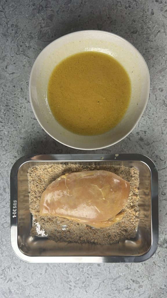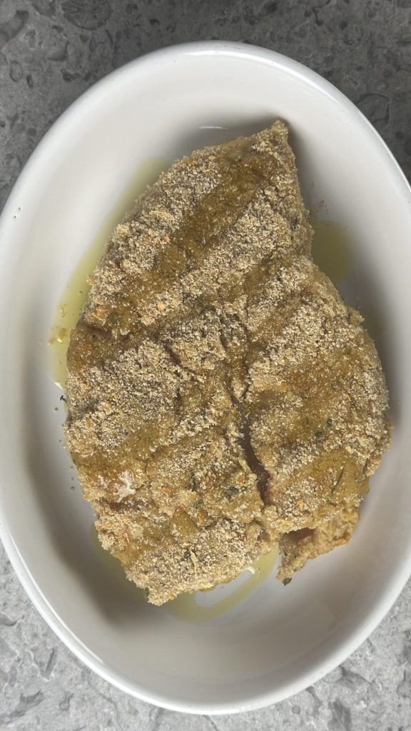 Dans cette version, le poulet est sublimé par une panure aromatique simple mais bien pensée : chapelure, origan et zeste d’agrumes créent une croûte légère qui protège la viande et concentre les saveurs. Le four fait le reste, cuisant de manière uniforme et laissant la poitrine de poulet juteuse à l’intérieur et dorée à l’extérieur.