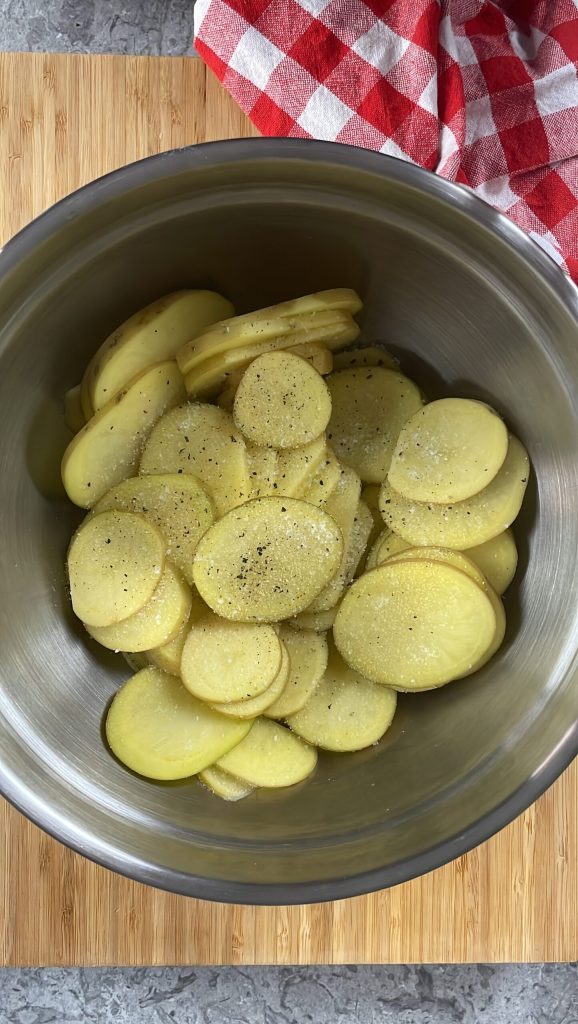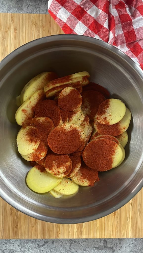 Coupe-les en tranches épaisses de pas plus d’un demi-centimètre.Transfère les pommes de terre dans un bol et assaisonne-les avec du sel, du poivre noir et de l’ail en poudre.