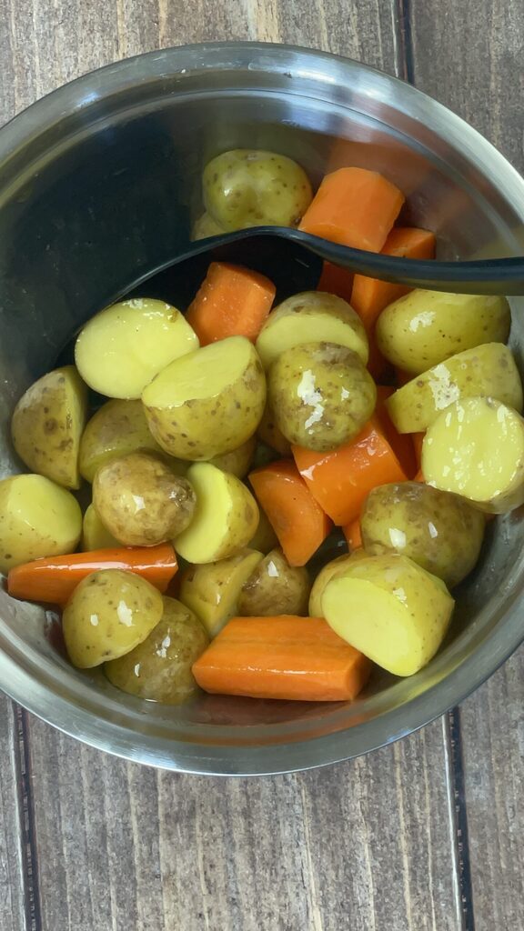 Mélangez avec une cuillère ou avec les mains jusqu’à ce que tous les morceaux de pommes de terre et de carottes soient complètement recouverts d’assaisonnement.