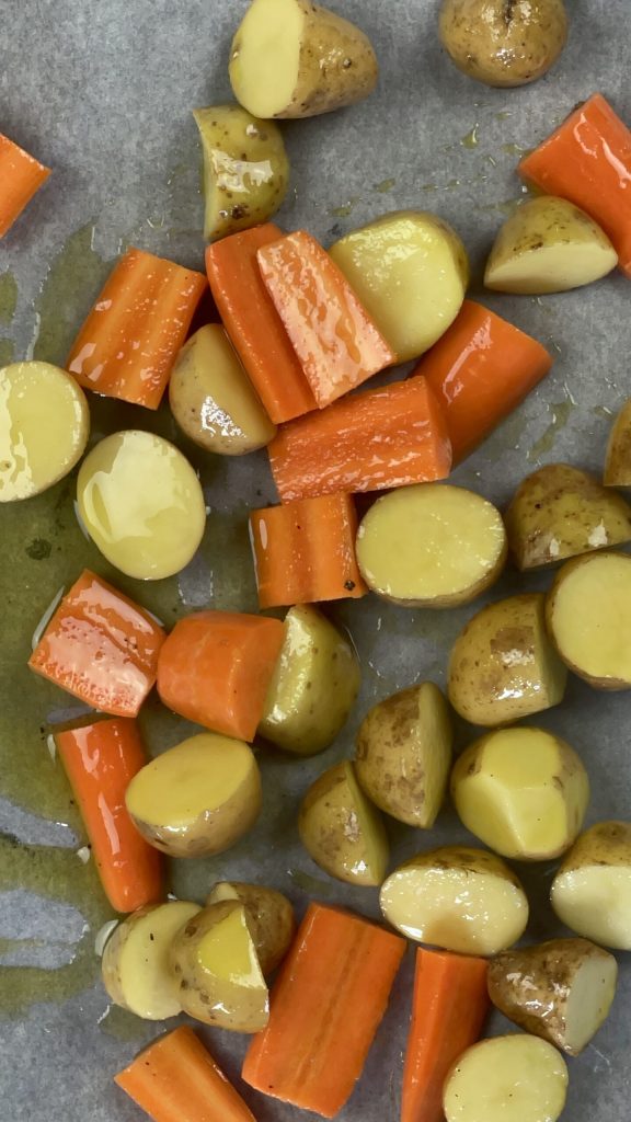 Transférez les légumes dans un bol.Assaisonnez les pommes de terre et les carottes avec 3/4 de l’assaisonnement préparé précédemment.