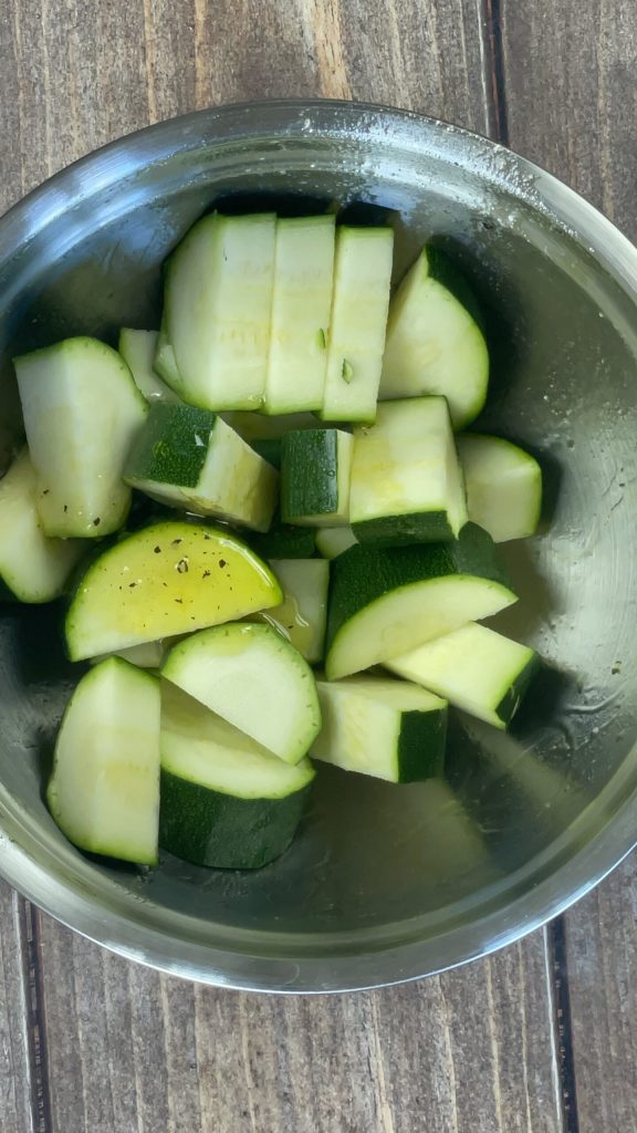 Entre-temps, lavez et coupez les courgettes en morceaux.