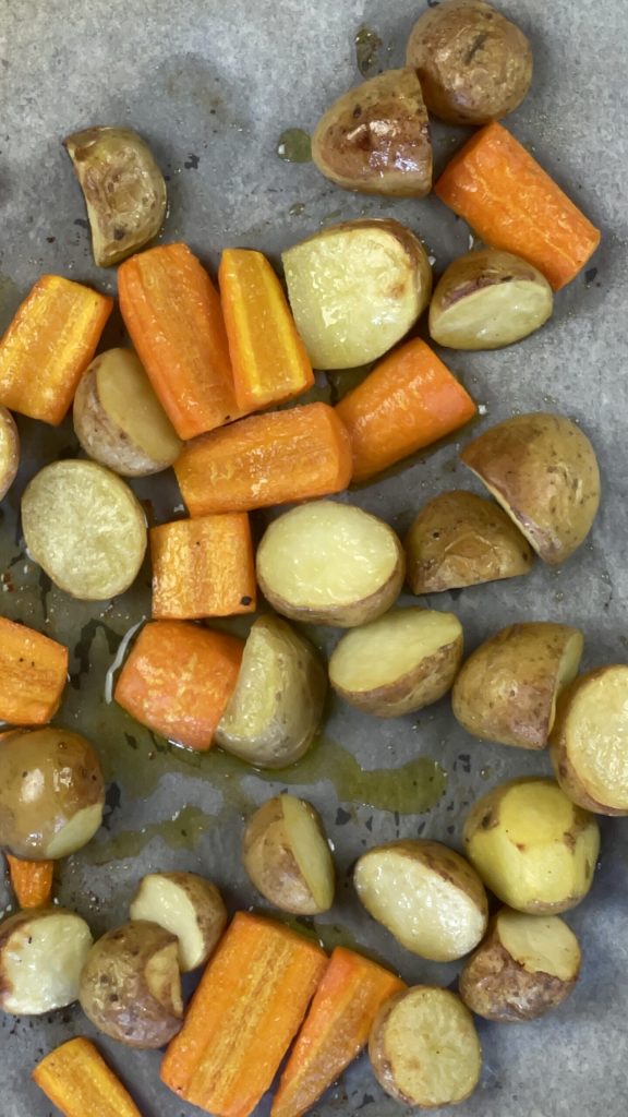 Mélangez avec une cuillère ou avec les mains jusqu’à ce que tous les morceaux de pommes de terre et de carottes soient complètement recouverts d’assaisonnement.Transférez les pommes de terre et les carottes sur une plaque de cuisson ou la lèchefrite du four et faites-les cuire dans un four statique préchauffé à 200°C pendant 20-25 minutes.