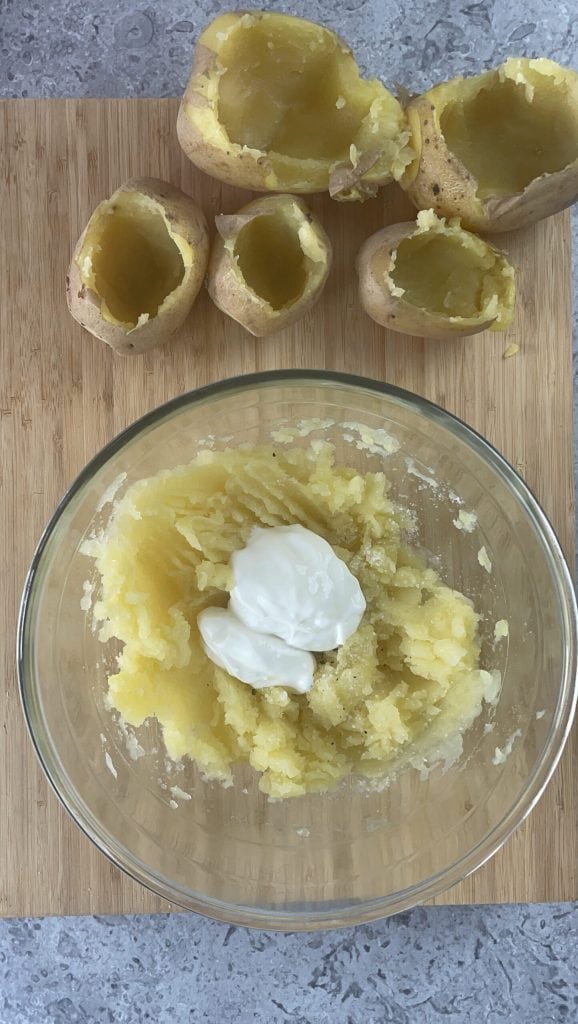 Mélangez bien jusqu’à ce que tous les ingrédients soient bien incorporés.Garnissez les coques de pommes de terre avec la farce préparée et placez-les dans un plat à gratin.