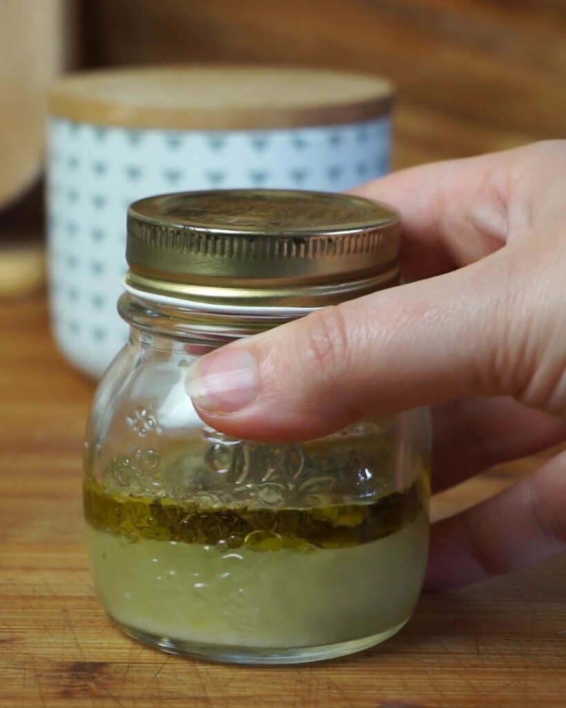 Commence la préparation du poulet à la grecque en préparant la marinade : mets tous les ingrédients prévus dans un bocal, ferme bien et agite vigoureusement pendant quelques secondes ; la partie huileuse et la partie aqueuse se mélangeront parfaitement.