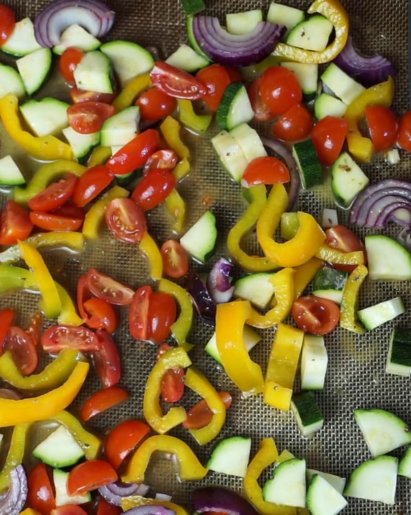 Coupe les tomates cerises en quartiers, l’oignon rouge en tranches fines. Continue avec la courgette en morceaux et le poivron en lanières. Mets tout sur le lèchefrite du four et mélange bien.