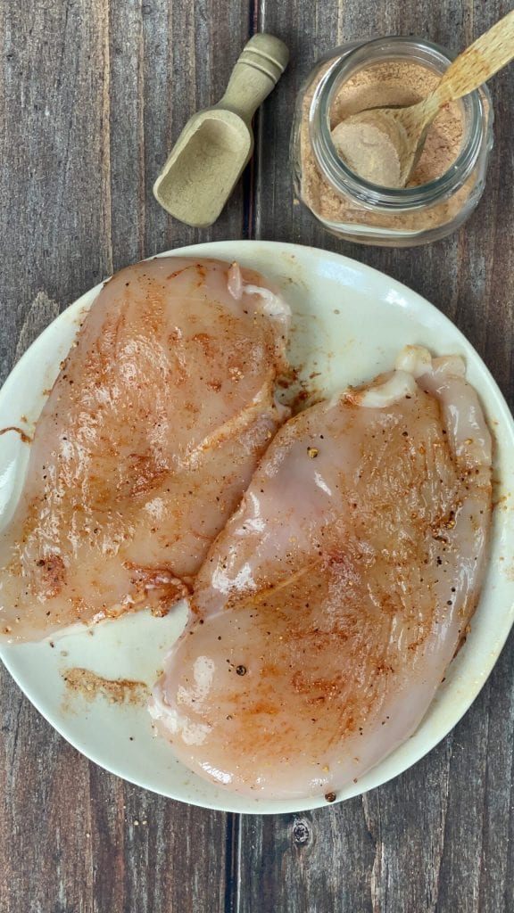 Assaisonnez le poulet avec les épices, j’ai utilisé mon rub pour barbecue à base de paprika fumé.Répartissez bien les épices avec les mains ou le dos d’une cuillère.