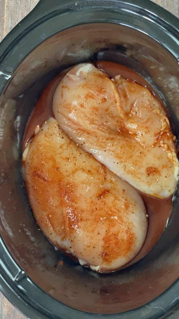 Ajoutez également les poitrines de poulet déjà marinées.Retournez le poulet quelques fois pour qu’il soit bien enrobé de sauce barbecue.