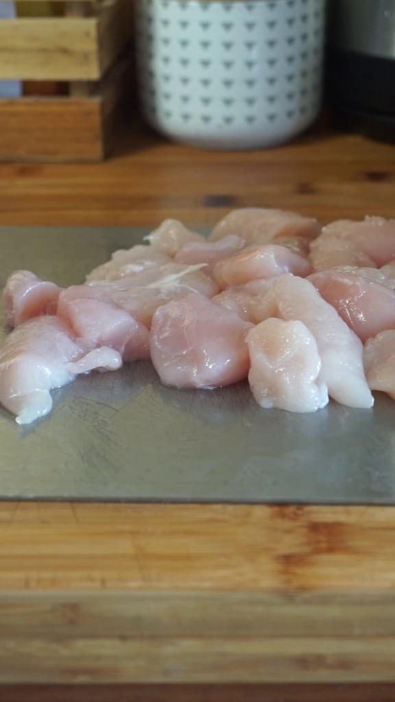 Commencez la préparation du poulet frit à l’orientale en coupant la poitrine de poulet en cubes de plus ou moins la même taille.
