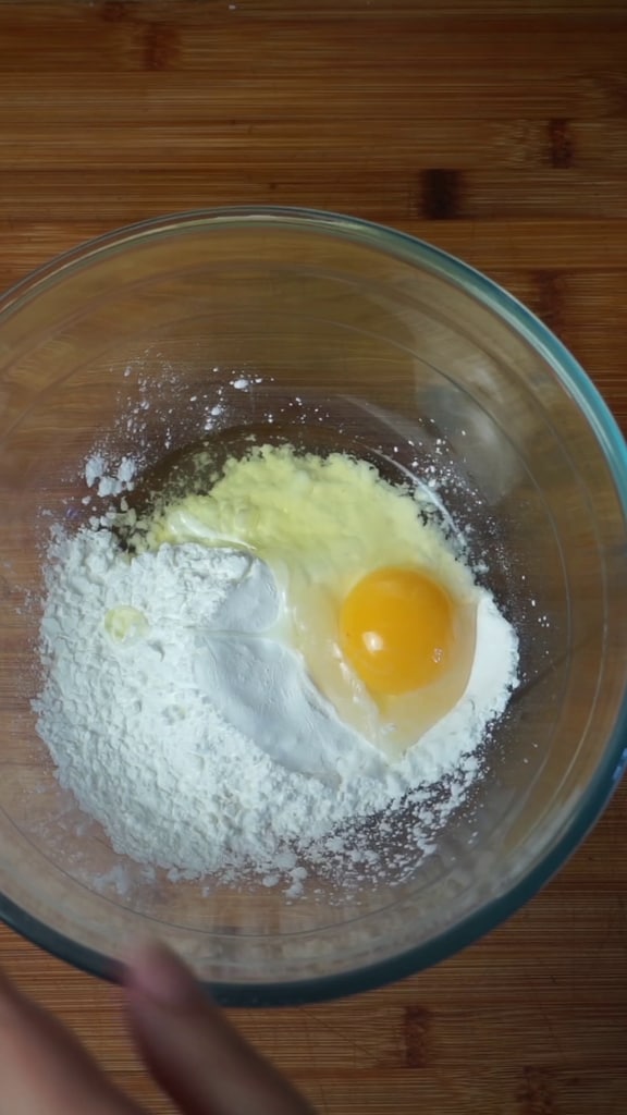 Mettez dans un saladier la farine 00, la fécule de maïs et un œuf de taille moyenne froid du réfrigérateur.