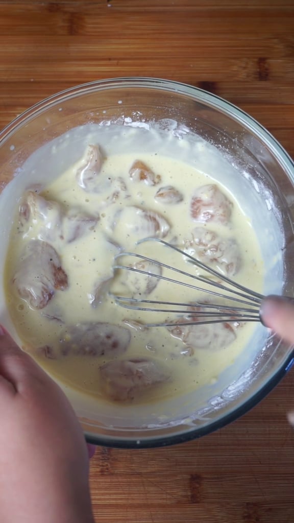 Versez le poulet dans la pâte fraîchement préparée et mélangez de manière à ce que tout le poulet soit recouvert de pâte.