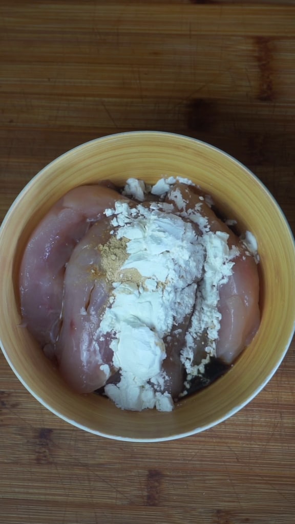 Commence la préparation du poulet mariné à la sauce soja en plaçant le blanc de poulet dans un bol.