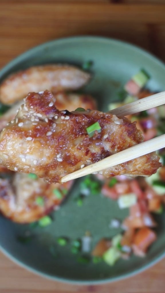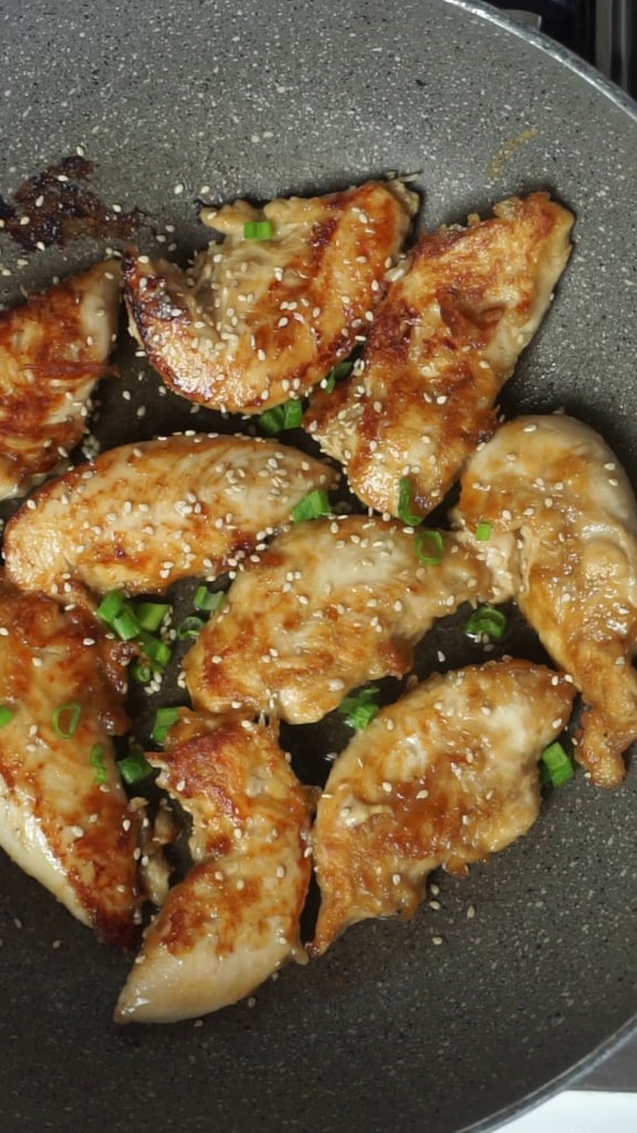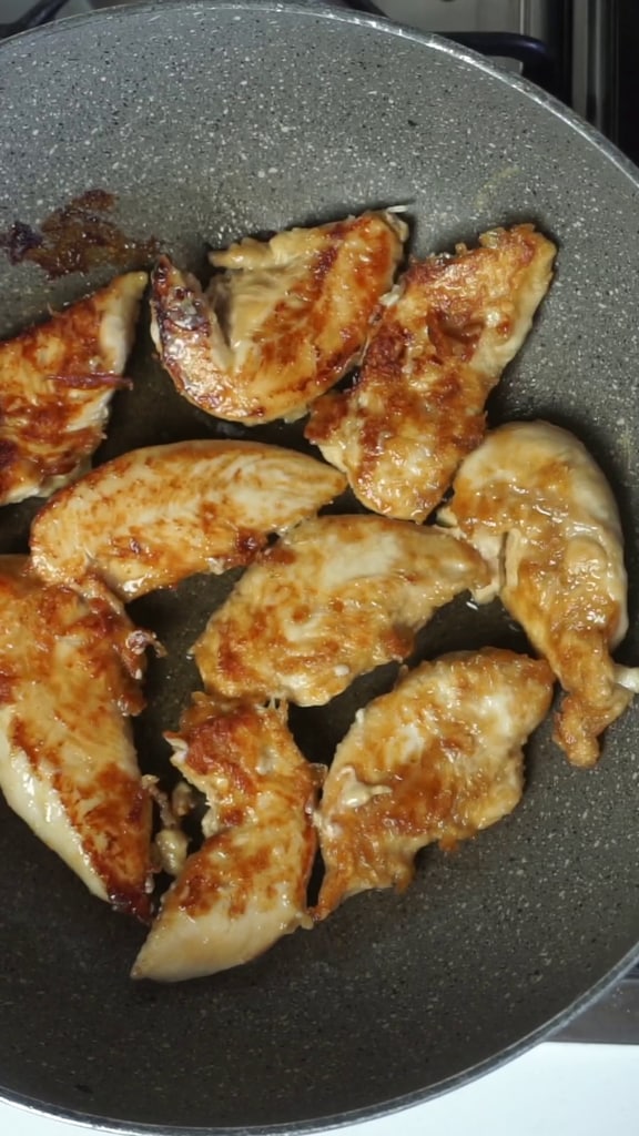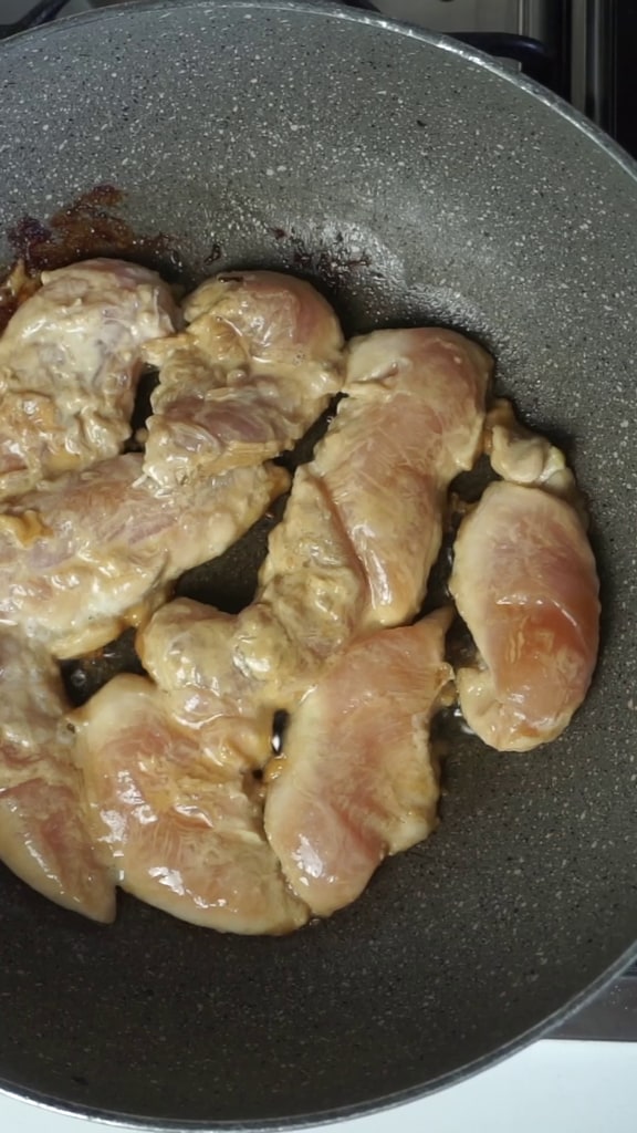Chauffe un peu d’huile d’olive extra vierge dans une poêle (encore mieux si tu trouves de l’huile de sésame). Verse le poulet mariné et fais cuire pendant 5 minutes : une belle croûte doit se former sur la viande.