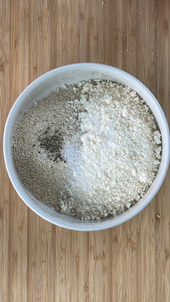 Mettez dans un bol la chapelure, le parmesan, le sel et le poivre noir.