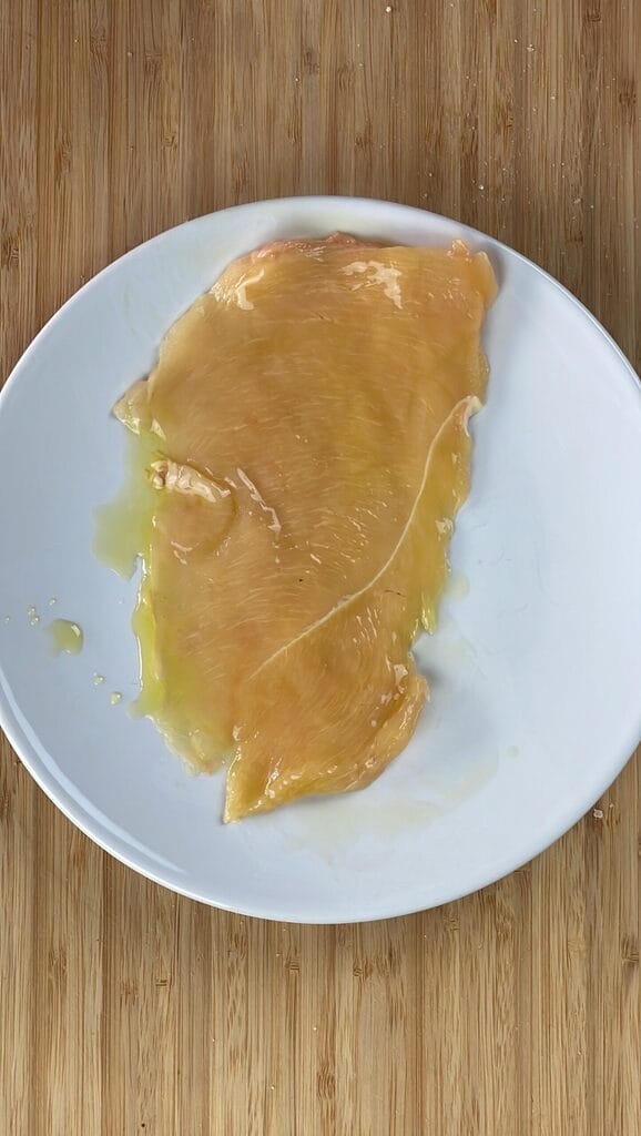 Recouvrez chaque tranche de filet de poulet avec un peu d’huile d’olive extra vierge.