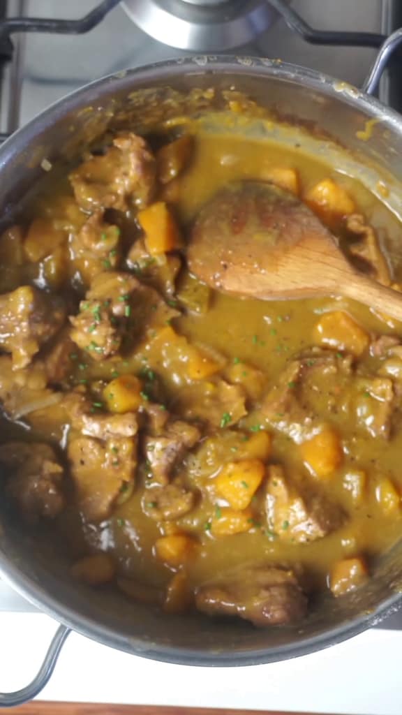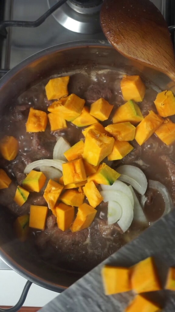 Le ragoût de bœuf à la courge est un plat unique ou un deuxième plat très crémeux et savoureux. Dans cette recette, la chair de bœuf est cuite longtemps pour devenir très tendre tandis que la courge coupée en dés se défait à la cuisson pour créer une sorte de sauce très crémeuse et veloutée. Le résultat est un parfait plat réconfortant pour la saison automnale et hivernale.