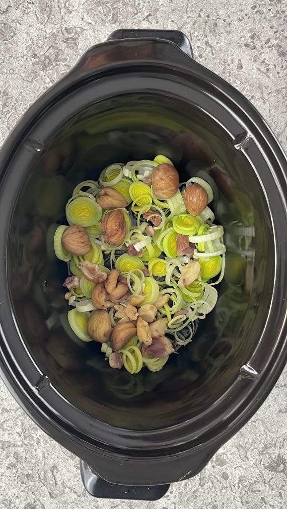 Mettez-le dans la mijoteuse avec une cuillère d’huile d’olive extra vierge et les châtaignes cuites à la vapeur.
