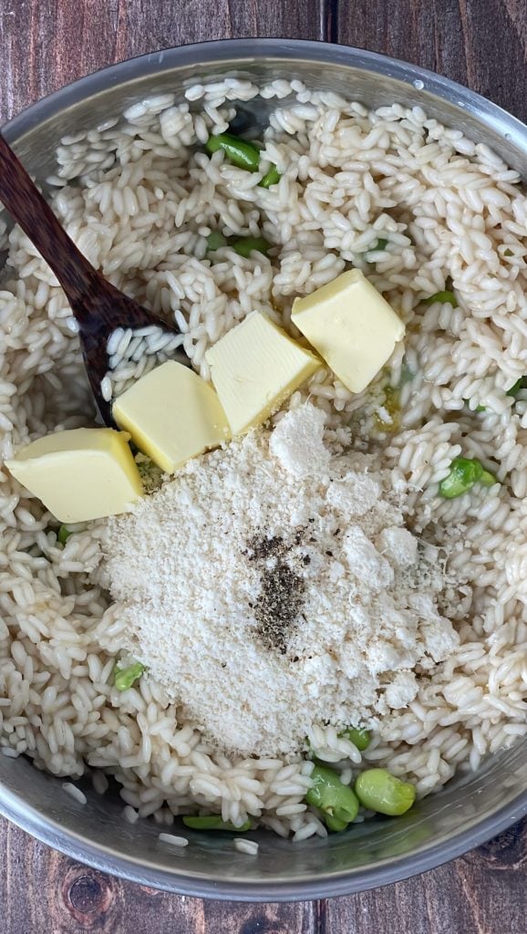Ajoutez les fèves et mélangez pour les répartir uniformément dans le risotto.Il ne vous reste plus qu’à onctueusement le risotto : ajoutez dans la casserole le beurre, le pecorino romano râpé et le poivre noir.