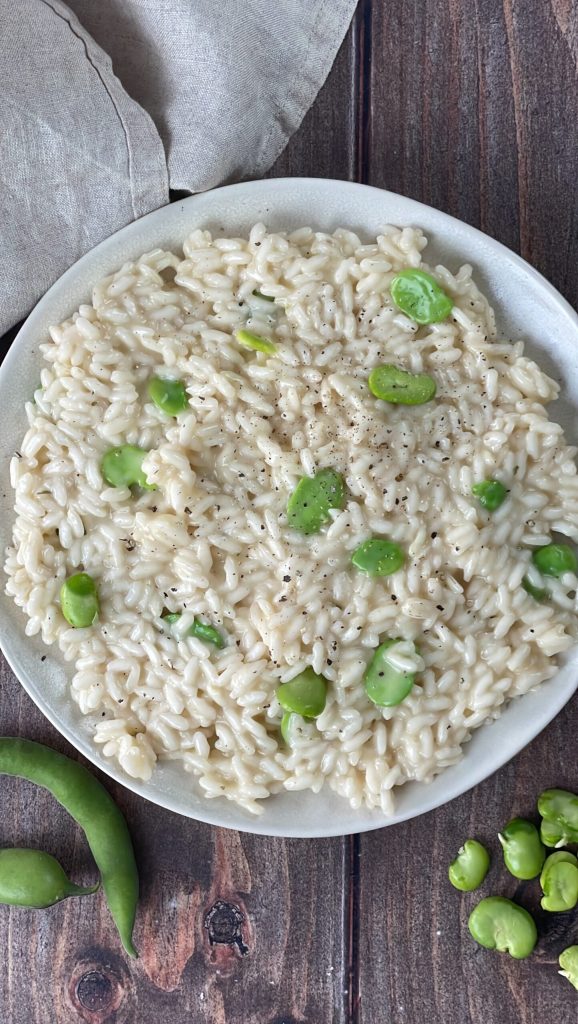 Risotto fèves et pecorino, un plat principal simple mais riche en saveurs, qui combine la douceur des fèves fraîches avec le goût prononcé et salé du pecorino romano.