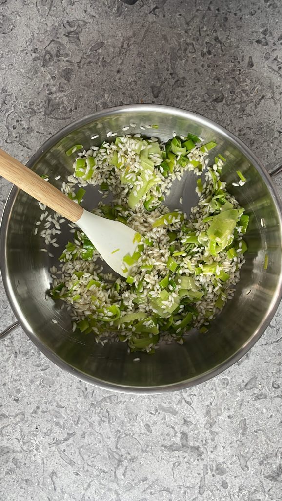 Les poireaux, doux et délicats, sont lentement fondus dans de l’huile d’olive extra vierge et une petite noix de beurre, juste le temps de les rendre tendres et parfumés. Le riz Carnaroli, choisi pour sa capacité à maintenir la cuisson et absorber les saveurs, est ensuite grillé et déglacé avec du vin blanc, initiant une cuisson classique et linéaire avec du bouillon de légumes chaud.