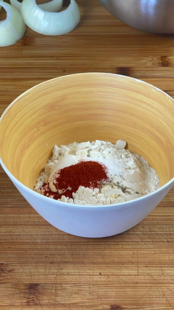 Ajoutez à la farine T45 une pincée d’ail en poudre, le sel, le poivre noir et une demi-cuillère à café de paprika fumé. Mélangez bien pour amalgamer toutes les poudres entre elles.