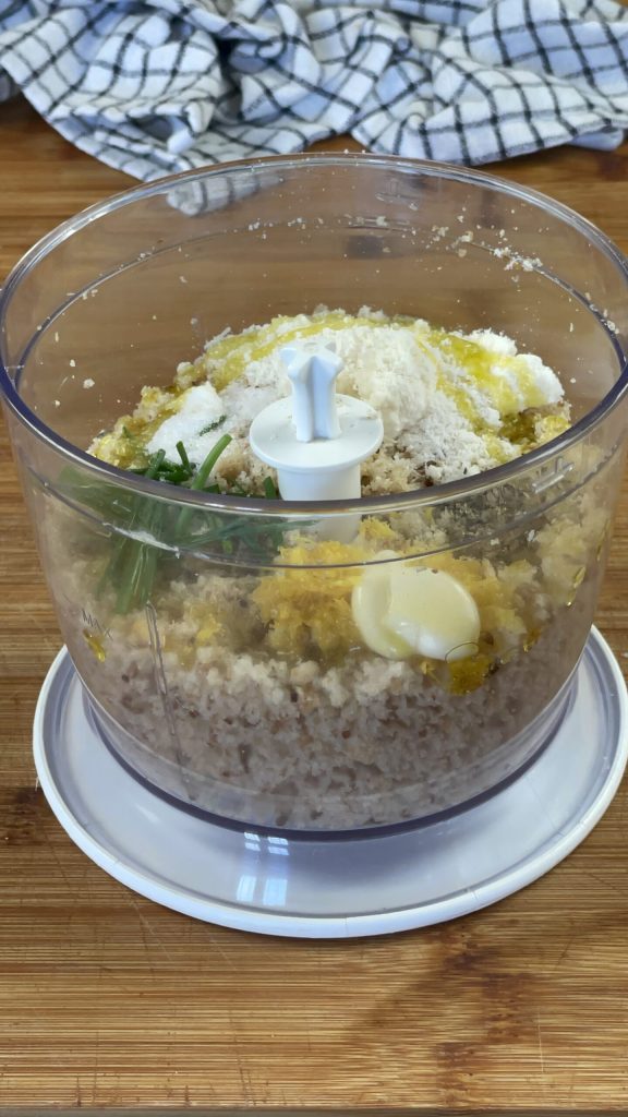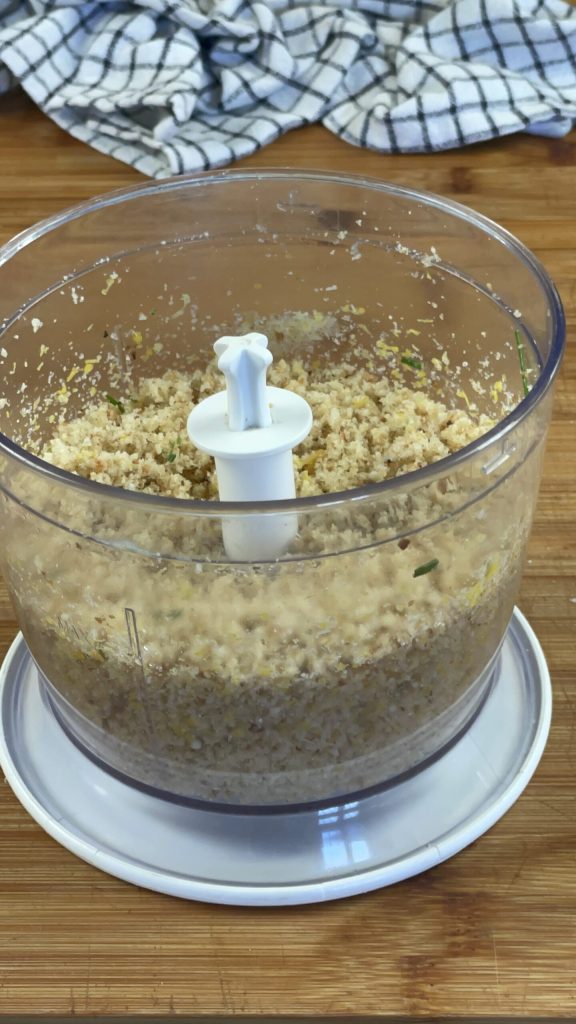 Ajoute à la mie une gousse d’ail privée de son germe, la ciboulette, le zeste d’un citron non traité, du sel et du poivre noir.Ajoute également un filet d’huile d’olive extra vierge.