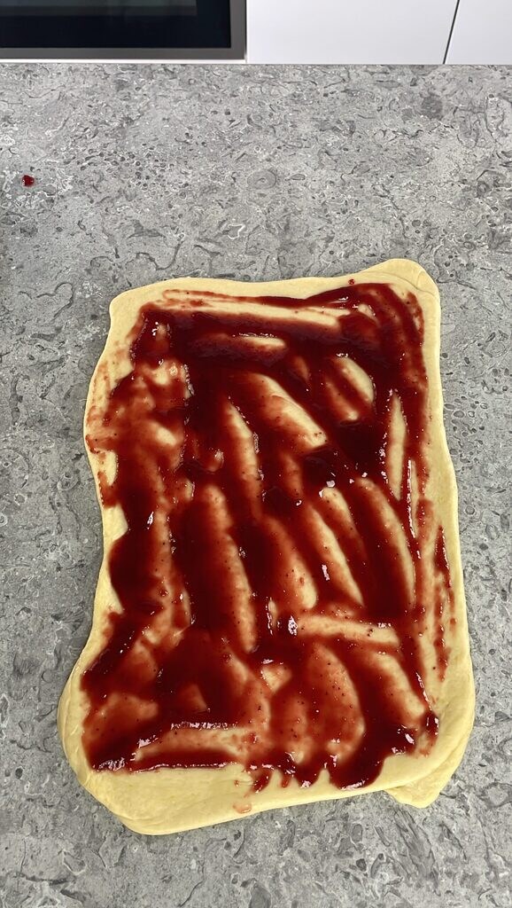 • Étalez la confiture de fruits rouges sur la pâte en laissant une marge d’environ 1 cm sur les deux côtés courts.