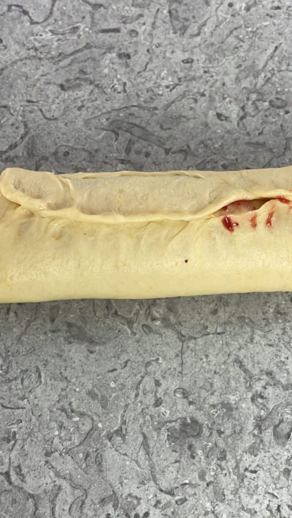 • Roulez la pâte le long du côté court et scellez bien le rouleau formé en pinçant la fermeture avec les doigts.