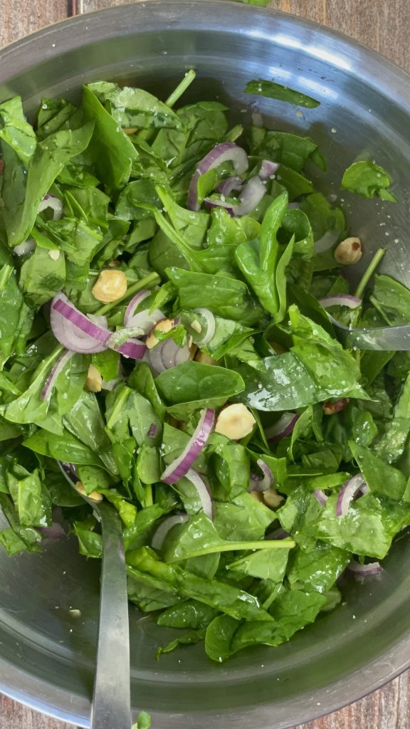 Transférez-les dans un petit bol et mettez-les de côté.Dans un bol plus grand, mettez les jeunes pousses d’épinards lavées et séchées, un oignon rouge finement tranché et une poignée de noisettes hachées.