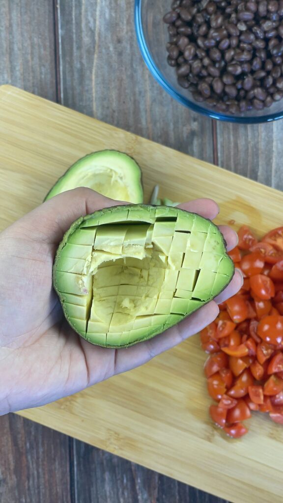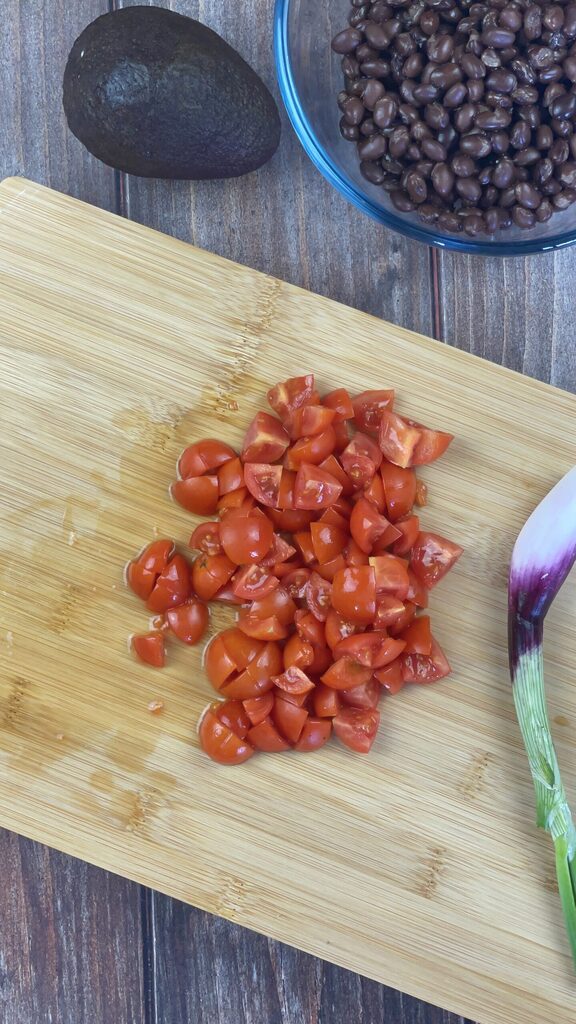 Ajoutez aux haricots les tomates cerises, l’oignon vert et l’avocat préparés précédemment.