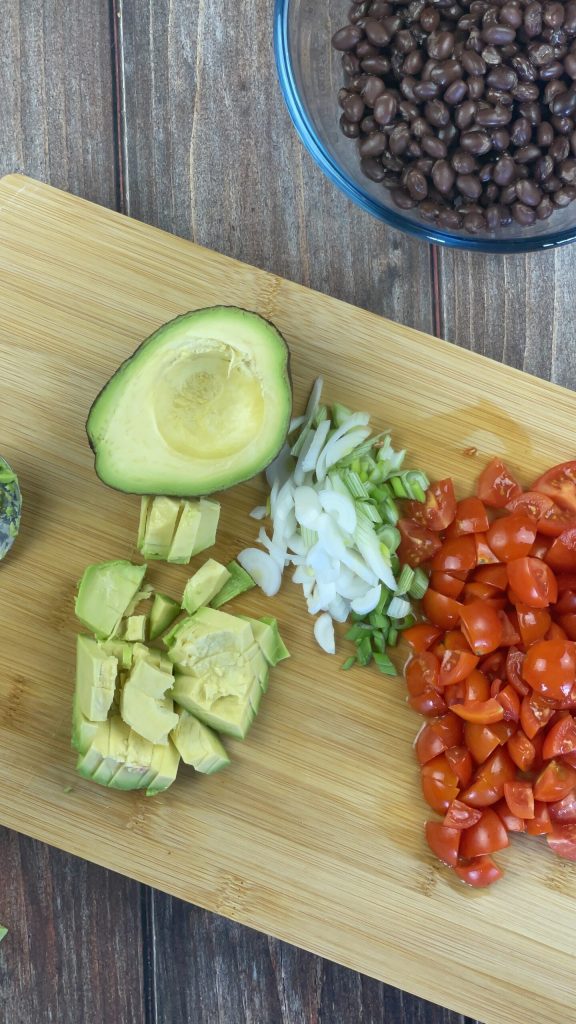 Mettez-les dans le bol où vous servirez la salade.Ajoutez aux haricots les tomates cerises, l’oignon vert et l’avocat préparés précédemment.