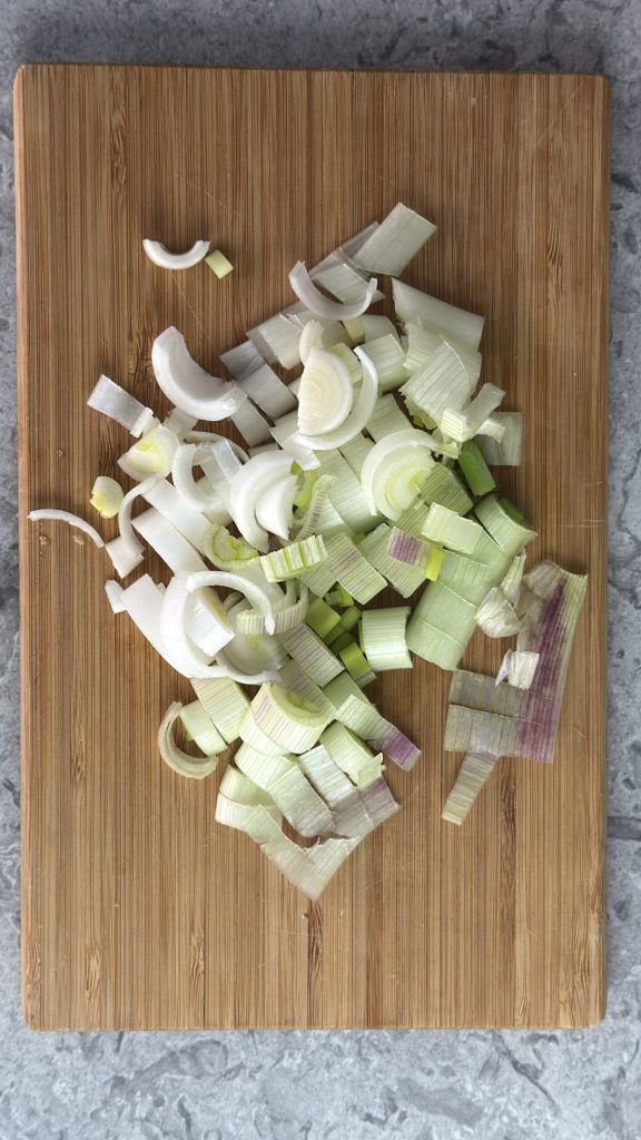 Épluche l’oignon nouveau, coupe-le en deux dans le sens de la longueur puis tranche-le en gardant aussi une partie du vert.